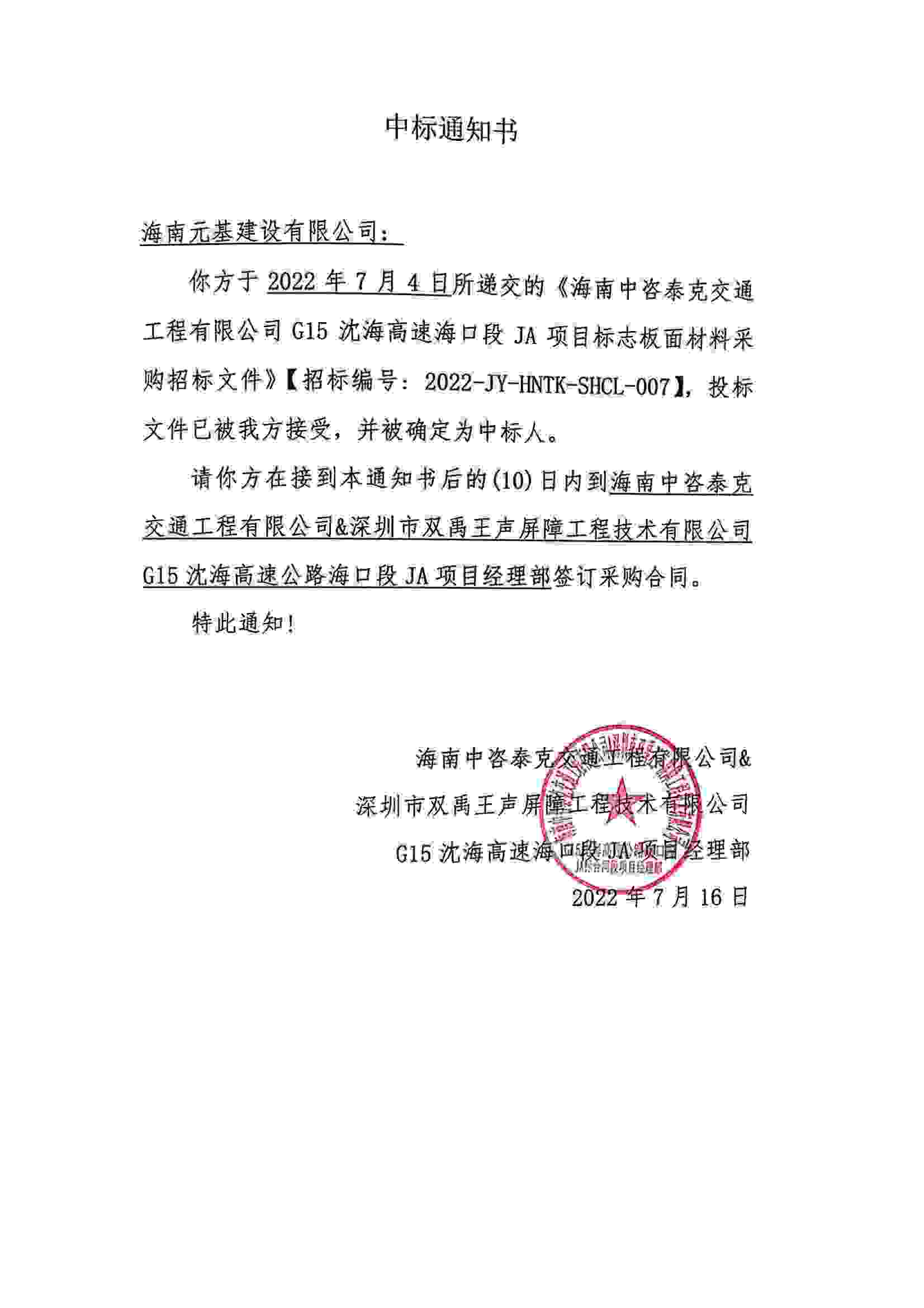 海南元基建設(shè)有限公司于2022年7月16日中標G15沈海高速??诙蜫A項目